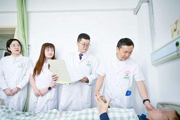 清晨,皮肤病防治院整形外科团队进行例行查房,轻柔检查患者伤口,并与患者低声交流康复情况。阳光洒入,画面严谨而温馨,尽显医者仁心。