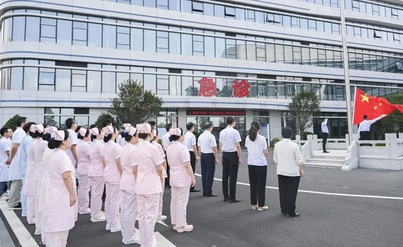 2025年8月1日清晨,仓山院区急诊大楼前,医院领导、科室负责人与急诊医护、行政后勤人员代表并肩列队,举行庄严升旗仪式。伴随国歌,五星红旗冉冉升起,这既是对祖国的崇高敬意,更彰显着急诊团队守护人民生命健康的坚定决心。