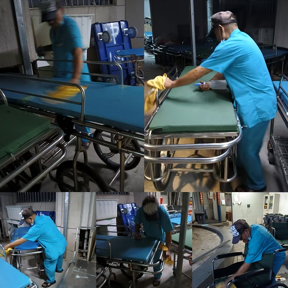 深夜,后勤保障部的物业保洁人员,正严格按照感控流程对病人转运推车进行深度清洁与消毒。他们默默无闻,却是院感防控的第一道防线,用汗水守护着医疗环境的洁净与安全。